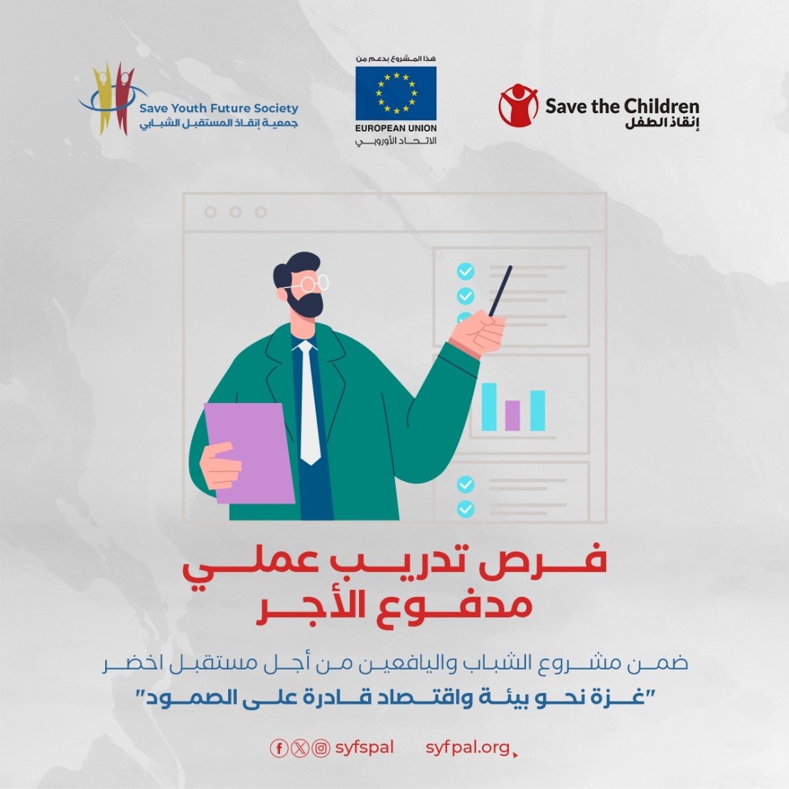 تعلن جمعية إنقاذ المستقبل الشبابي، بالشراكة مع مؤسسة إنقاذ الطفل الدولية، عن توفير فرص تدريب عملي مدفوعة الأجر لـ 90 شابًا وشابة من المتقدمين، وذلك بعد دراسة وتقييم البيانات الواردة في نموذج التسجيل.
