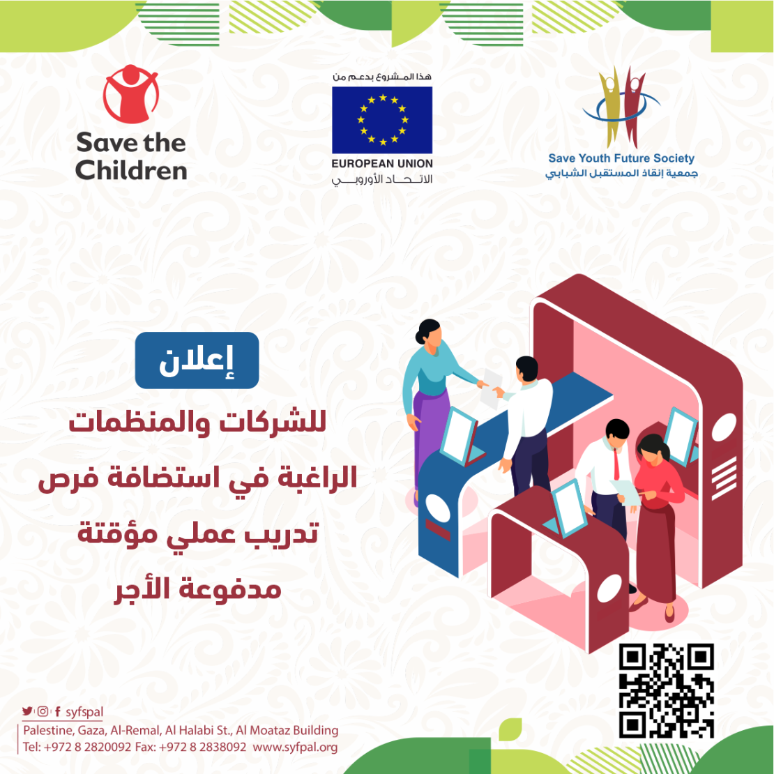 تعلن جمعية إنقاذ المستقبل الشبابي ضمن برنامج "برنامج تعزيز المرونة الاقتصادية في غزة" من خلال مشروع " الشباب و اليافعين من أجل مستقبل أخضر: غزة نحو بيئة و اقتصاد قادر على الصمود " بالشراكة مع إنقاذ الطفل الدولية بتمويل من الاتحاد الأوروبي عن توفر فرص تدريب عملية مدفوعة الأجر للشباب من كلا الجنسين اللذين تتراوح أعمارهم بين 18-29 عاما من خريجي الجامعات وكليات و مراكز التعليم والتدريب التقني و المهني في قطاع غزة للعمل في الشركات والجمعيات المحلية والدولية ومؤسسات القطاع الخاص والمصانع والورش الحرفية العاملة والجامعات و الكليات الأهلية.