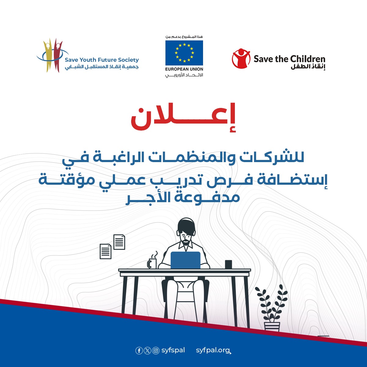 تعلن جمعية إنقاذ المستقبل الشبابي ضمن برنامج "برنامج تعزيز المرونة الاقتصادية في غزة" من خلال مشروع " الشباب و اليافعين من أجل مستقبل أخضر: غزة نحو بيئة و اقتصاد قادر على الصمود " بالشراكة مع إنقاذ الطفل الدولية بتمويل من الاتحاد الأوروبي عن توفر فرص تدريب عملية مدفوعة الأجر للشباب من كلا الجنسين اللذين تتراوح أعمارهم بين 18-29 عاما من خريجي الجامعات وكليات و مراكز التعليم والتدريب التقني و المهني في قطاع غزة للعمل في الشركات والجمعيات المحلية والدولية ومؤسسات القطاع الخاص والمصانع والجامعات و الكليات الأهلية.